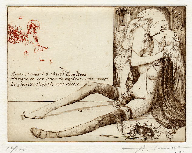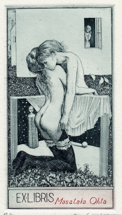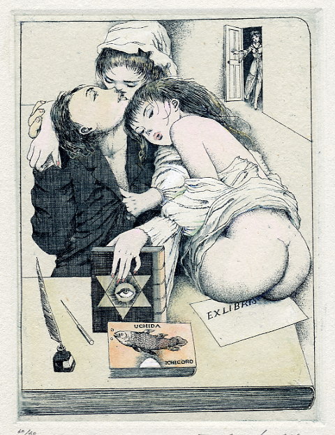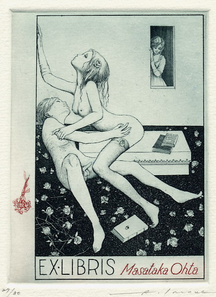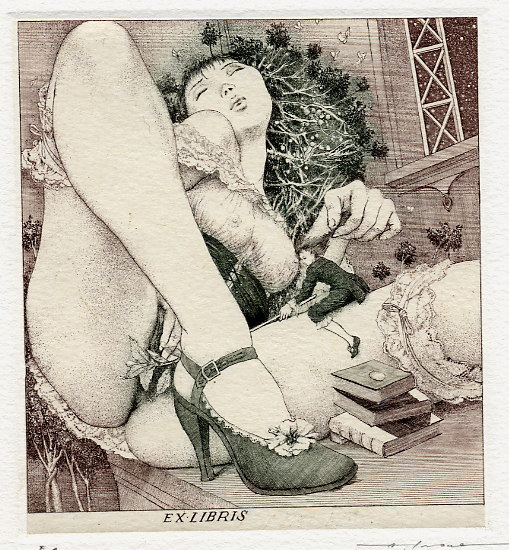 Alphone Inoue est un peu un mystère: il semblerait que ce soit un artiste japonais qui réalise des ex-libris érotiques très inspirés dans leur fond et leur forme par l’art symboliste du début du XXème siècle mais je n’ai pas vraiment trouvé d’informations précises. Et ce sont toujours les mêmes images qui circulent sur Internet.
